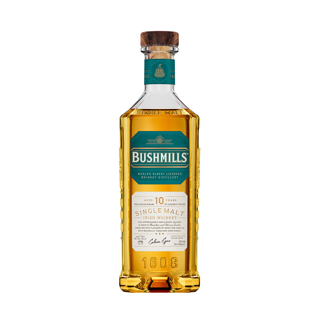 Bushmills 10 year old Single Malt Irish Whiskey ist ein irischer Single Malt Whiskey, der ausschliesslich aus 100 % gemälzter Gerste hergestellt und dreifach destilliert wird. Er reift mindestens zehn Jahre lang in einer Kombination aus ehemaligen Bourbon- und Oloroso-Sherryfässern. Diese Reifung verleiht ihm Aromen von Honig, Vanille und Milchschokolade. Der Geschmack ist ausgewogen mit Noten von Schokolade, Vanille, Backgewürzen und Honig. Der Abgang ist mild und leicht süsslich. Mit einem Alkoholgehalt von 40 % Vol. ist dieser Whiskey für puren Konsum, auf Eis oder als Bestandteil von Cocktails geeignet.