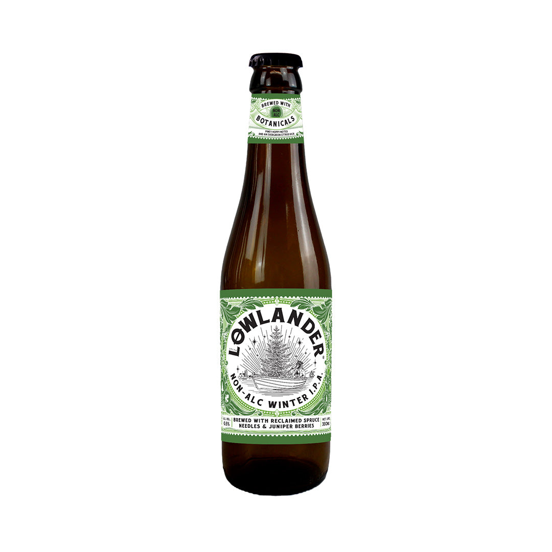 Dieses Bier enthält Weihnachtsbäume. Aber wie kriegt man einen Fichtenbaum in eine Flasche? In dem man eine Nadel nach der anderen in die Flasche füllt. Jedes Jahr landen Millionen von Weihnachtsbäumen nach den Feiertagen auf der Strasse oder in Entsorgungsstellen, was eine ziemliche Verschwendung ist. Lowlander hat daher beschlossen, das Non-Alc. I.P.A. passend zur Weihnachtszeit mit handverlesenen Fichtennadeln und Wacholderbeeren zu brauen. Das Ergebnis: Ein kühles und knackiges, alkoholfreies Winter I.P.A. mit subtilen Zitrusnoten und einem hopfigen Charakter. Mit gutem Gewissen ein geschmackvolles Bier geniessen und etwas Gutes für sich und die Umwelt tun.